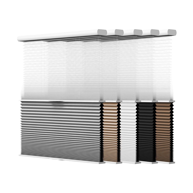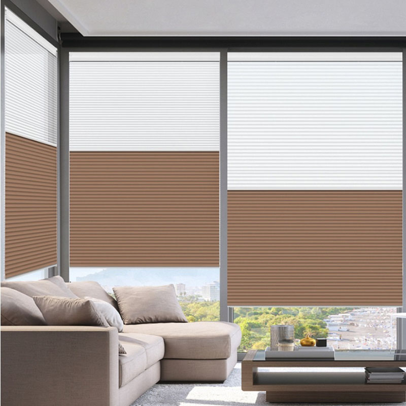 Double-layer honeycomb blinds feature a unique honeycomb structure with built-in aluminum foil, providing heat insulation, thermal retention and noise reduction. This is a 2-in-1 honeycomb blinds, when you want to enjoy warm sunlight, the light-filtering honeycomb shade creates a soft dimming effect. When you need full privacy or a cool environment, the blackout pleated shade blocks out all light and sight. It’s like having two honeycomb blinds that you can switch between at any time.